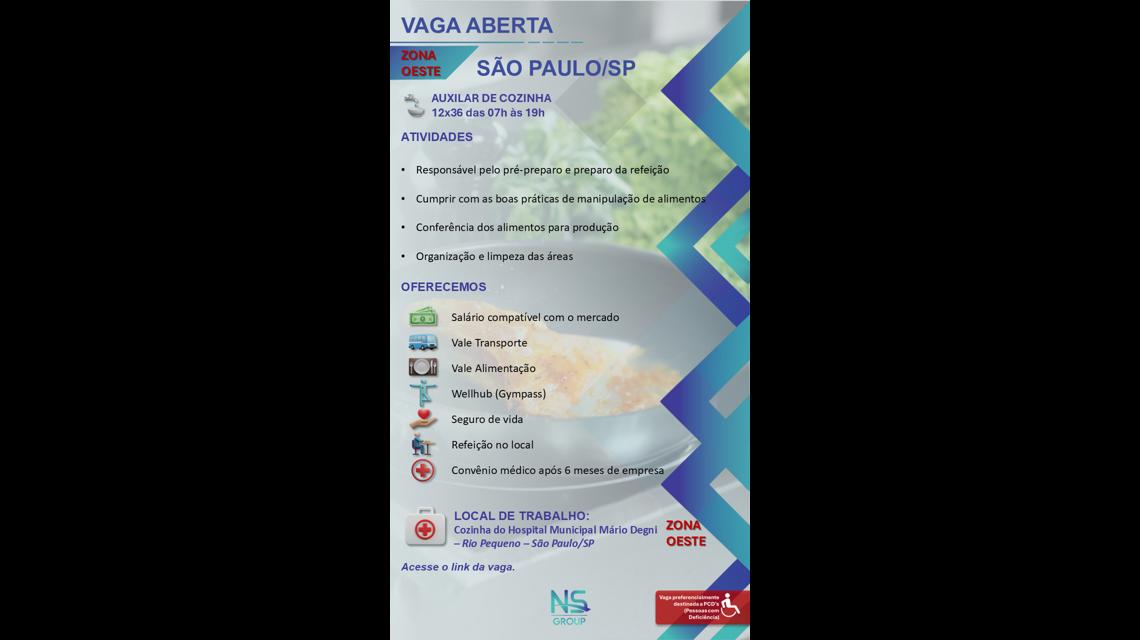 Auxiliar de Cozinha - 12x36 - Cozinha do Hospital Municipal Prof. Mario Degni - Rio Pequeno - Zona Oeste de SP